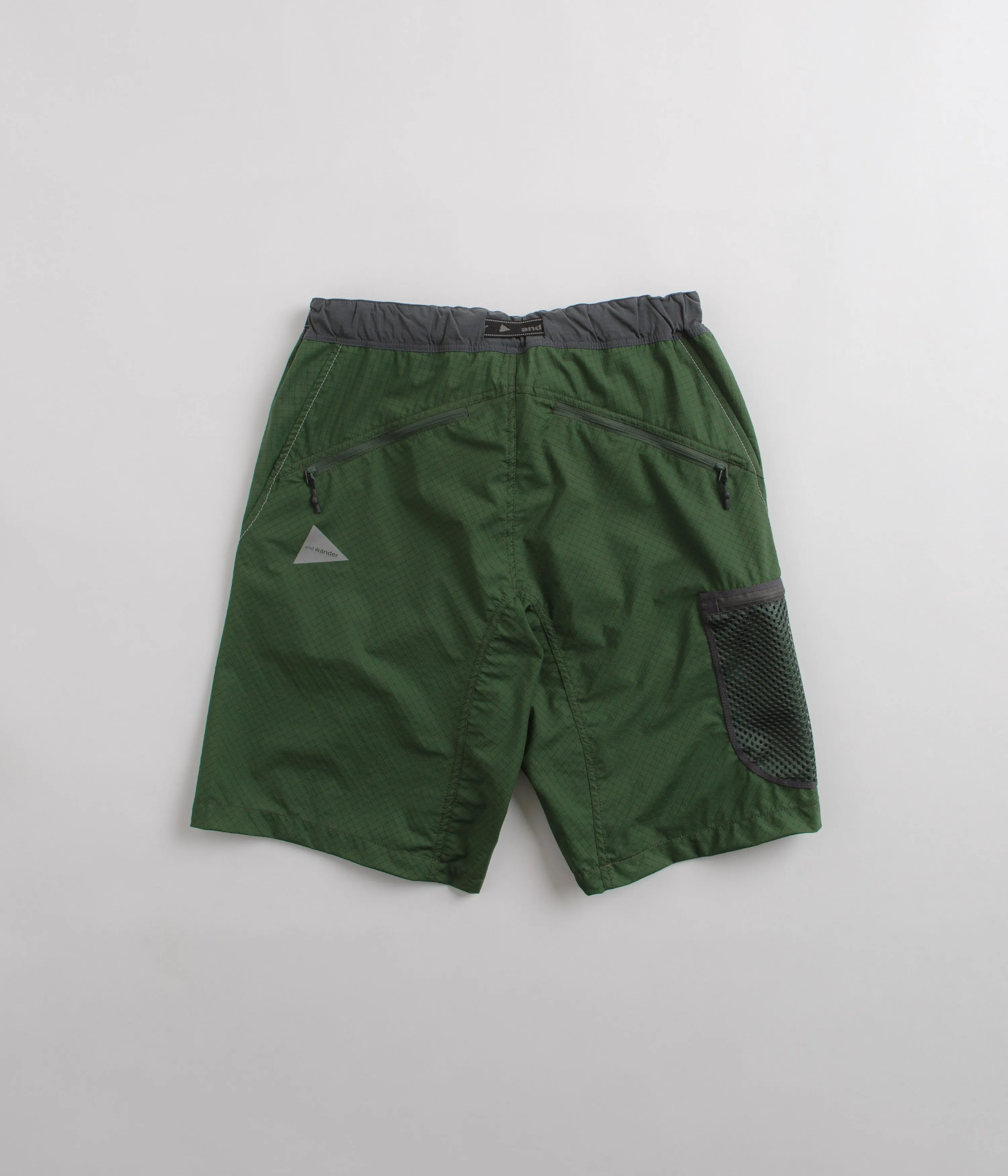 +and wander Breath Rip Shorts in Green. Tailored to a regular fitting from nylon ripstop, these and wander shorts are designed with a DWR shell and reflector stitch detailing. Featuring an elasticated waist, a removable webbing belt and an additional front mesh pocket, these green and wander shorts are finished with two zippered front pockets, two zippered rear pockets and with printed logo branding.